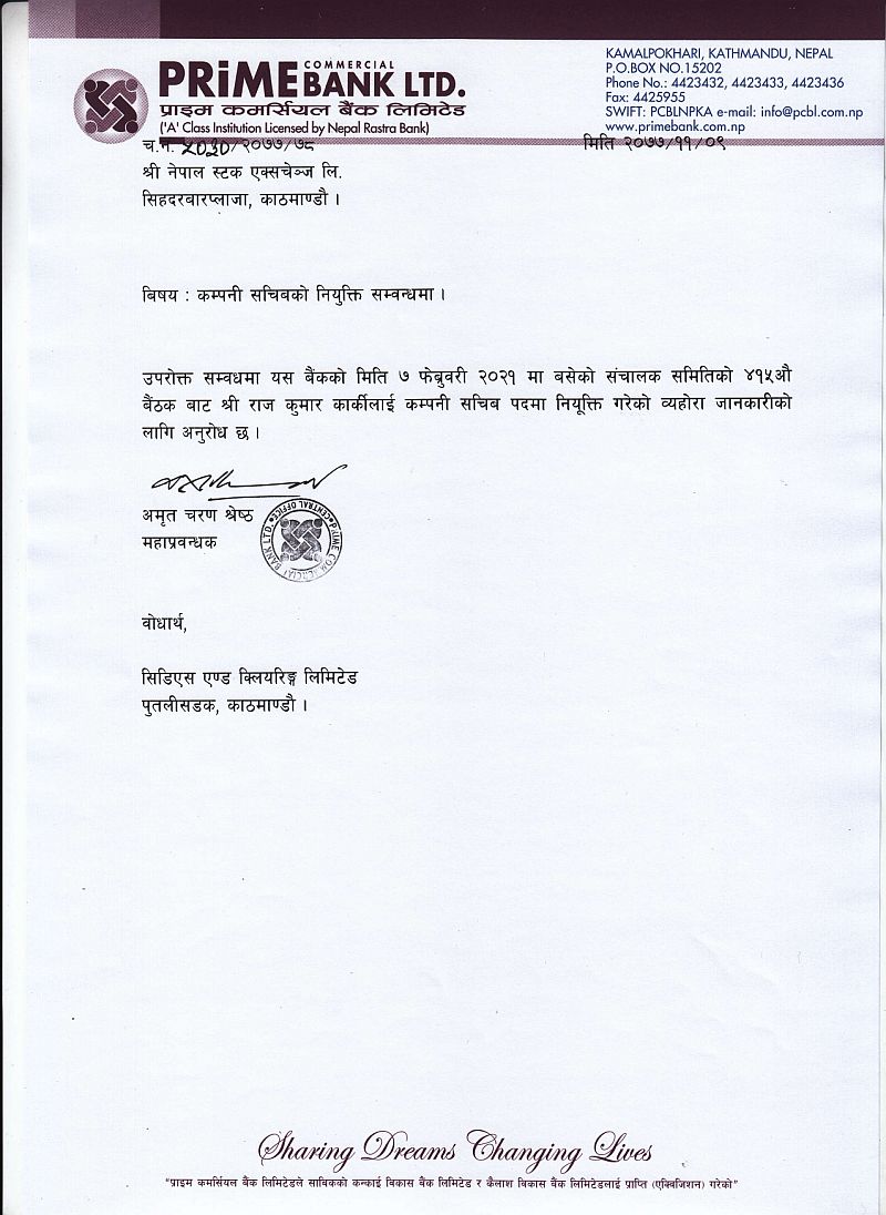 काठमाडौं । प्राइम कमर्सियल बैंक लिमिटेडको कम्पनी सचिवमा राज कुमार कार्की नियुक्त भएका छन् । कम्पनीको माघ २५ गतेको सञ्चालक समितिको बैठकले कार्कीलाई कम्पनी सचिवमा नियुक्त गरिएको हो ।