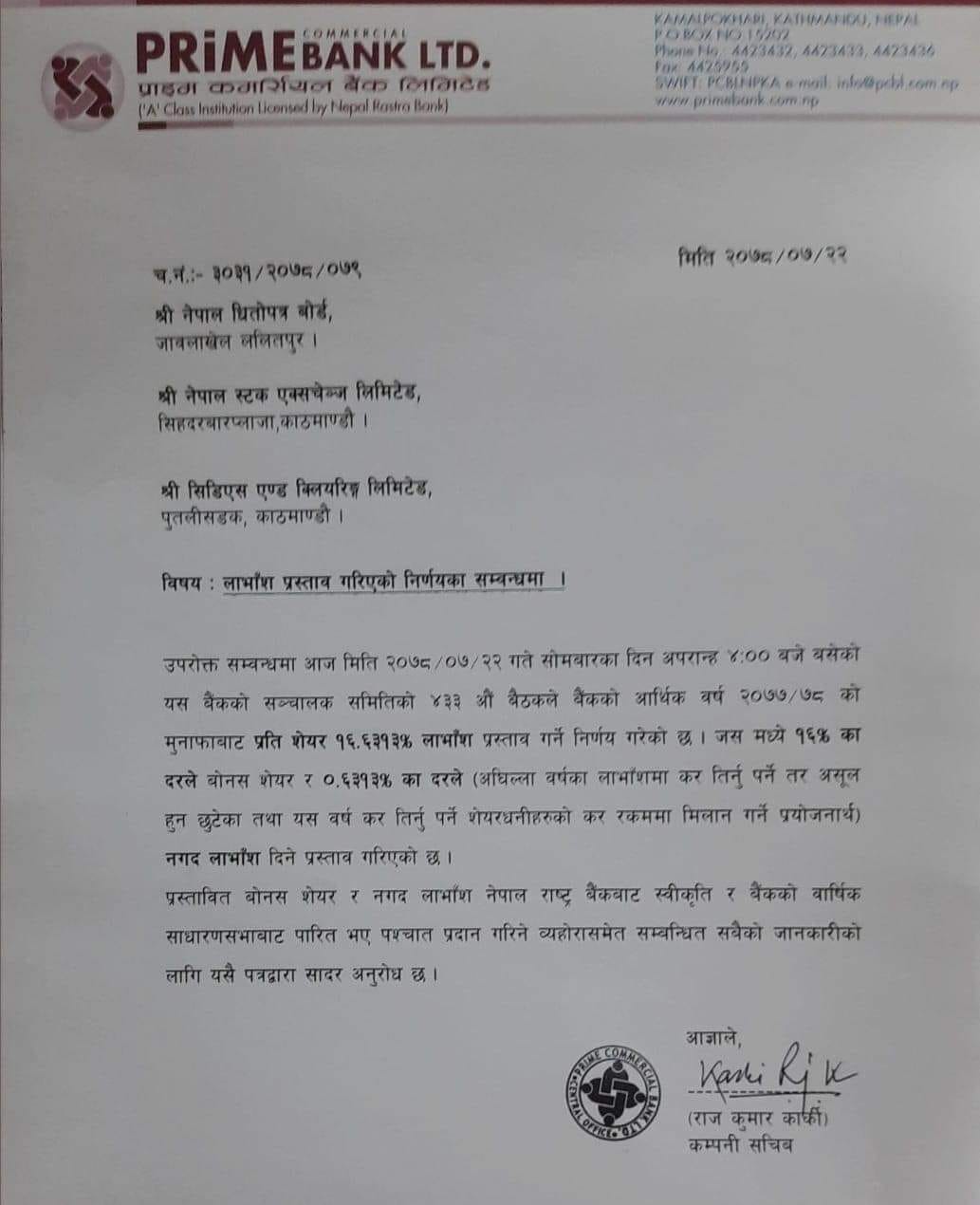 प्राइम कमर्सियल बैंकको लाभांश प्रस्ताव, १६% बोनश शेयर वितरण गर्ने