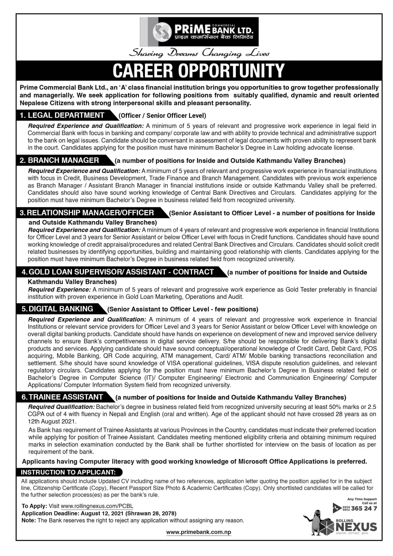 काठमाडौं । प्राइम कमर्सियल बैंकले विभिन्न पदका लागि कर्मचारी माग गरेको छ । बैंकले लिगल डिपार्टमेन्टमा अफिसर र सिनियर अफिसर लेभलका लागि केही, ब्रान्च म्यानेजरका लागि केही, रिलेशनसिप म्यानेजरमा केही, गोल्ड लोन सुपरभाइजरमा केही, डिजिटल बैकिङ अफिसर र प्रशिक्षार्थी असिस्टेन्टका लागि केही संख्यामाकर्मचारीको माग गरेको हो ।
