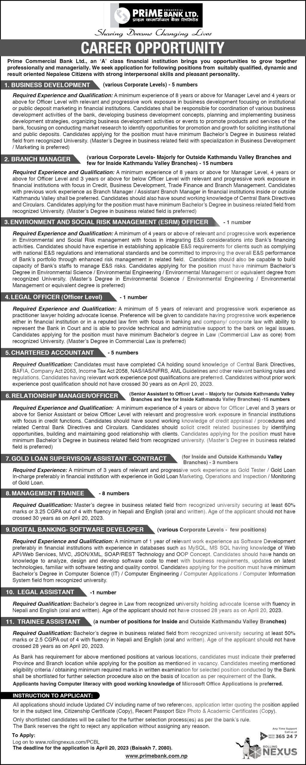 बैंकले बिजनेस डेभलपमेन्ट देखि ट्रेनि एसिस्टेन्टसम्मका ११ पदका लागि अनुभवि र क्षमतावान कर्मचारकिो मगा गरेको छ । बैंकका अनुसार सो पदहरुमा आवेदन दिनको लागि मान्यताप्राप्त शैंक्षिक संस्थाहरुबाट स्नात्तक देखि स्नाकोत्तर तह उत्तिर्ण गरेको हुनपर्ने छ । ईच्छुक तथा योग्यता पुगेका उम्मेदवारले बैशाख ७ गतेभित्र बैंकको वेवसाइट मार्फत आवेदन दिन सक्नेछन् ।