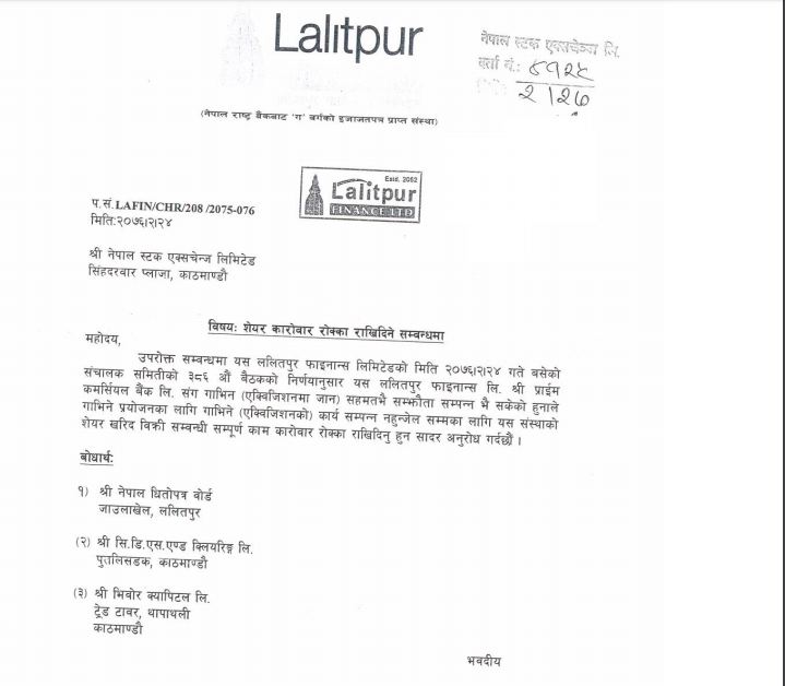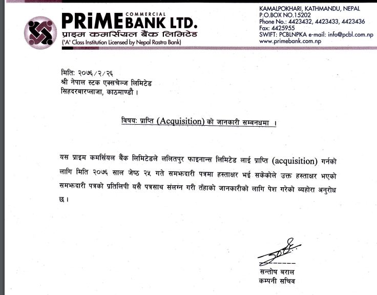 प्राइम कमर्सियल बैंकले ललितपुर फाइनान्सलाई प्राप्ती (एक्विजिसन) गर्ने भएको छ । एक्विजिसन सम्बन्धी सम्झदारी पत्रमा (जेठ २५ गते) शनिबार हस्ताक्षर भइसकेको छ । प्राइमसँग मर्जरमा जाने सहमतिसँगै ललितपुर फाइनान्सको शेयर कारोबार पनि रोक्का भएको छ ।