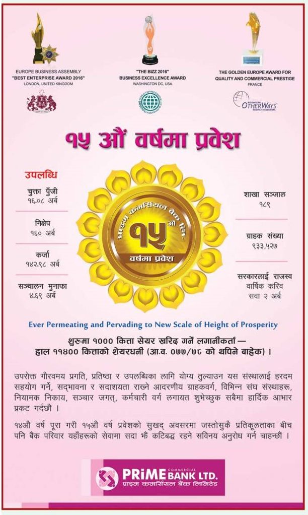काठमाडौं । प्राइम कमर्सियल बैंकको सुरुमा १००० कित्ता शेयर खरिद गर्ने लगानीकर्ताको आर्थिक वर्ष ७६/७७ को लाभांश सम्म हिसाब गर्दा ११ हजार ४०० कित्ता शेयर पुगेको छ। कम्पनी १५औ वर्ष पुगेको अवसरमा सो जानकारी दिएको हो। कम्पनीले आर्थिक वर्ष ७७/७८ को लाभांश प्रस्ताव नगरेको अवस्थामा अझै शेयर थपिने सम्भावना छ। कम्पनीले प्रदान गरेको तथ्याङ्कलाई आधार मान्दा लगानीकर्ताको शेयर ११ गुणा भन्दा धेरैले वृद्धि छ।