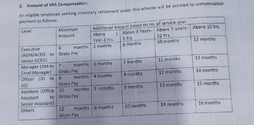 उच्च व्यवस्थापन तहमा कार्यरत कर्मचारीहरुहरुले स्वच्छिक अवकास हुन चाहेमा न्युनतम ६ महिनाको तलब सुविधा पाउने छन् । यसका अतिरिक्त एक वर्षदेखि तीन वर्षसम्म काम गरेका कर्मचारीहरुका हकमा थप २ महिनाको तलब प्राप्त गर्ने छन् । त्यस्तै तीन वर्षदेखि ५ वर्ष काम गरेकाले अतिरिक्त ६ महिना, ५ वर्षदेखि १० वर्ष काम गरेकाले अतिरिक्त १० महिना र १० वर्ष भन्दा बढि अवधि काम गरेकाले थप १२ महिनाको तलब बुझ्ने छन् । यस्तो तलब पछिल्लो समय उनिहरुले बुझ्दै आएको तलब रकम अनुसार पाउने छन् ।