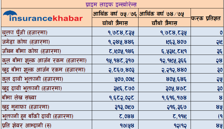 काठमाडौँ। प्राइम लाइफ इन्स्योरेन्सले आर्थिक वर्ष २०७५ /७६ को चौथो त्रैमासको वित्तीय विवरण प्रकाशन गरेको छ । इन्स्योरेन्सले गत आर्थिक वर्षको चौथो त्रैमाससम्ममा ३१ करोड ३० लाख रुपैयाँ खुद नाफा कमाएको छ । गत आर्थिक वर्षको सोही अवधिको तुलनामा इन्स्योरेन्सको नाफा ४५ प्रतिशतले बढी हो । अघिल्लो आर्थिक वर्षको सोही अवधिमा कम्पनीले २१ करोड ६३ लाख रुपैयाँ मात्र खुद नाफा कमाएको थियो ।