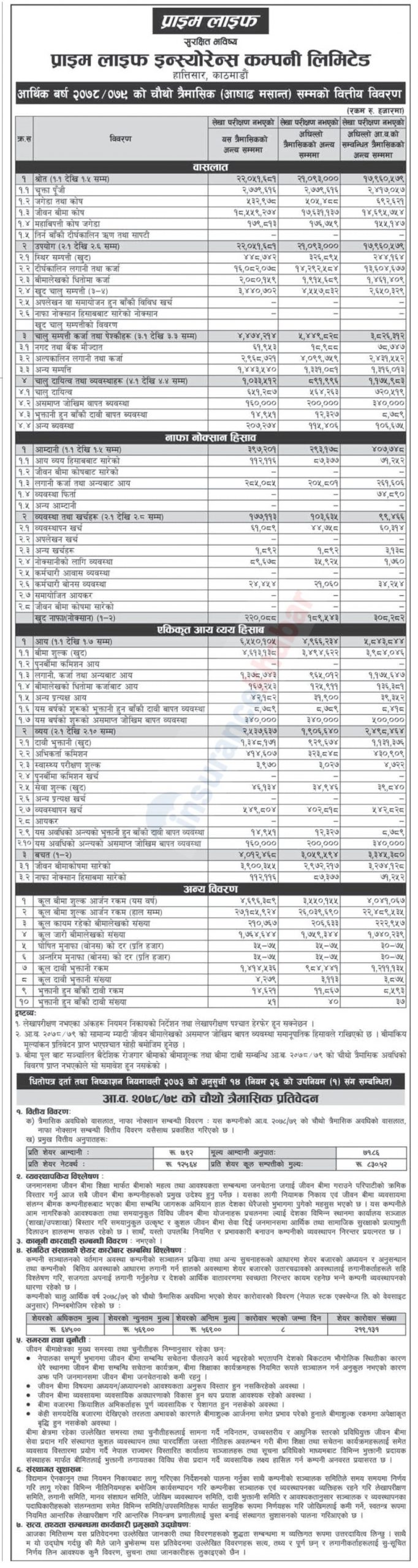 प्रकाशित तथ्यांक अनुसार कम्पनीको वार्षिक प्रति शेयर आम्दानी ७ रुपैयाँ ९२ पैसा र किताबी मूल्य १२५ रुपैयाँ ६४ पैसा छ । गत आर्थिक वर्षमा १ अर्ब ४१ करोड कुल दावी भुक्तानी गरेको कम्पनीले १ करोड ४६ लाख भुक्तानी गर्न बाँकी दावी रकम रहेको छ ।