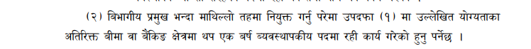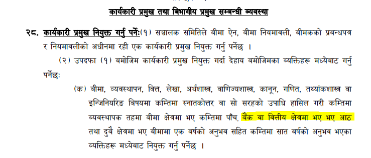 तर यस निर्देशिकाको दफा ३१ को उपदफा २ मा ‘विभागीय प्रमुख भन्दा माथिल्लो तहमा नियुक्त गर्नु परेमा उपदफा (१) मा उल्लेखित योग्यताका अतिरिक्त बीमा वा बैंकिङ क्षेत्रमा थप एक वर्ष व्यवस्थापकीय पदमा रही कार्य गरेको हुनु पर्नेछ’ भनिएको छ ।  उपदफमा एकमा शैक्षिक योग्यता उल्लेख छ । दाहालको शैक्षिक योग्यतामा कुनै कैफियत छैन । त्यसैले उनलाई एक वर्ष बीमाको अनुभव भन्ने व्यवस्थाले समस्यामा पारेको छ ।