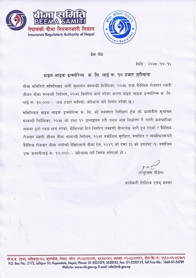 प्राइम लाइफलाई १० हजार रुपैयाँ जरिवाना, नक्कली कर्मचारीको नाममा ठुलो रकम निकासा गरेको ठहर