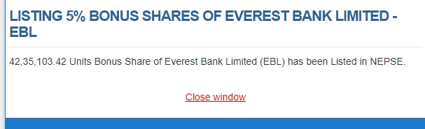 काठमाडौँ । नेपाल स्टक एक्सचेञ्ज लिमिटेड(नेप्से)मा प्राइम लाइफ र एभरेष्ट बैंकको शेयर सूचीकृत भएको छ। नेप्सेमा बैंकको ४२ लाख ३५ हजार १ सय २.४२ कित्ता बोनस शेयर सूचीकृत भएको हो ।बैंकले शेयरधनीहरुलाई प्रदान गरेको ५ प्रतिशत बोनस बापतको उक्त शेयर आज सूचीकृत भएको हो ।