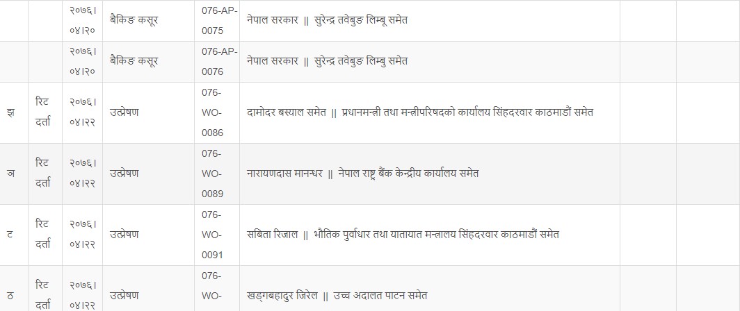 सर्वोच्च अदालतमा दायर ०७६–डब्लुओ–००८९ नम्बरको उत्प्रेषणको आदेश माग गरिएको मुद्दाको आज पनि सुनुवाई हुने सम्भावना न्यून देखिएको हो । गत २३ गते हेर्न नभ्याइएको नारायणदास मानन्धरको मुद्दा आजको पेशीमा चढेको थियो । यसअघि साउन २३ गते न्यायाधिस मीरा खड्काको बेन्चमा परेको थियो । आजको पेशीमा प्रधानन्यायाधिस चोलेन्द्र शम्सेर जबराको इजलासमा रहेको उनको मुद्दाभन्दा अगाडि ३५ वटा मुद्दा रहेकाले हेर्न भ्याउने सम्भावना न्यून रहेको हो ।