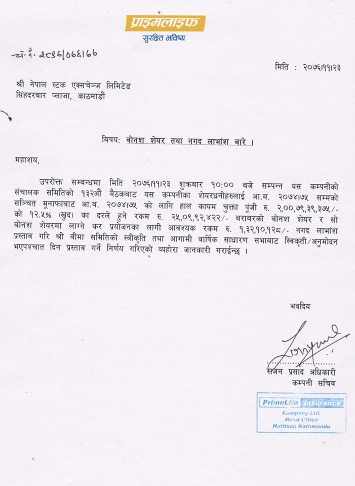 प्राइम लाईफ इन्स्योरेन्स कम्पनीले आव २०७४।०७५ को सञ्चालन मुनाफाबाट २५ करोड नौ लाख ९२ हजार ४२२ रुपैयाँ बोनस शेयर बापत खर्च गर्ने जनाएको छ । बोनस शेयर पश्चात कम्पनीको कुल चुक्ता पुँजि दुई अर्ब २५ करोड ८९ लाख ३१ हजार पुग्नेछ । त्यस्तै कम्पनीले बोनस शेयरमा लाग्ने कर प्रयोजनको लागि एक करोड ३२ लाख १० हजार १२८ रुपैयाँ नगद लाभांश दिने प्रस्ताव गरेको छ ।