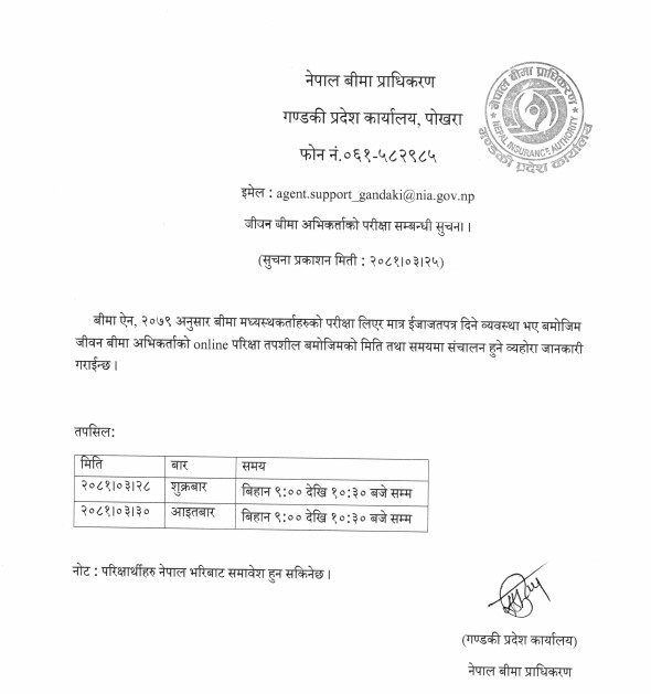 काठमाडौं । नेपाल बीमा प्राधिकरणको गण्डकी प्रदेश कार्यालयले असार २८ गते र असार ३० गते जीवन बीमा अभिकर्ताको अनलाइन परीक्षा गर्ने भएको छ । सम्बन्धी समय तालिका सार्वजनिक गरेको छ । प्राधिकरणले बीमा ऐन २०७९ अनुसार जीवन बीमा मध्यस्थकर्ताहरुको परीक्षा लिएरमात्रै इजाजत दिने व्यवस्था भएबमोजिम जीवन बीमा अभिकर्ताको अनलाइन परीक्षाको समय तालिका सार्वजनिक गरेको हो ।