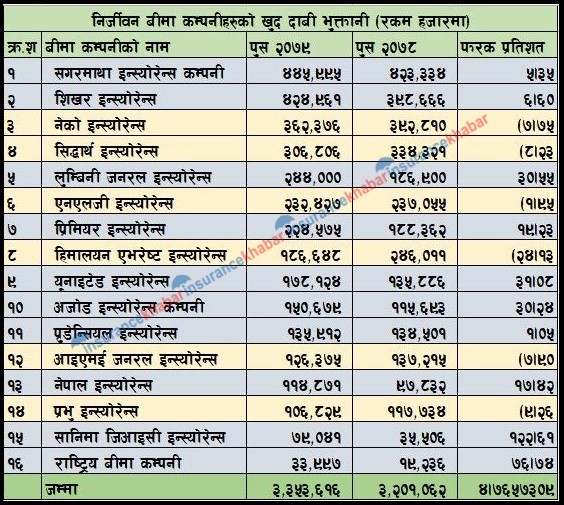 पुस महिनासम्ममा निर्जीवन बीमा कम्पनीहरुले ३ अर्ब ३५ करोड ३६ लाख १६ हजार रुपैयाँ खुद दाबी भुक्तानी गरेका छन् । यी कम्पनीहरुले गत आर्थिक वर्षको सोही अवधिमा ३ अर्ब २ करोड १० लाख ६२ हजार रुपैयाँ खुद दाबी भुक्तानी गरेका थिए । गत आर्थिक वर्षको सोही अवधिको तुलनामा कम्पनीको खुद दाबी भुक्तानी ४ प्रतिशतले बृद्धि भएको अर्थात यी कम्पनीहरुले गत वर्षको तुलनामा ४ प्रतिशत रकम बढी तिरेका हुन् ।