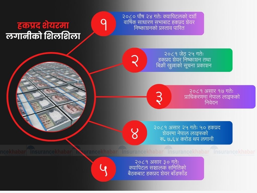 नेपाल लाइफ क्यापिटलले हकप्रद शेयरबापतको रकम जम्मा गर्न संस्थापक शेयरधनीहरुलाई गत जेठ २५ गते नै सार्वजनिक सूचनामार्फत आह्वान गरेको थियो। हकप्रद शेयर निष्कासनको निर्णय र सो सम्बन्धमा सार्वजनिक सूचना प्रकाशन गरेको २४ दिनपछि बल्ल नेपाल लाइफका तर्फबाट हकप्रद शेयरबापत थप पुँजी लगानी गर्न बीमा प्राधिकरणमा निवेदन पेस गरिएको थियो। प्राधिकरणले थप पुँजी लगानी प्रस्तावबारे अध्ययन गरेर निर्णय लिन पर्याप्त समय उपलब्ध नहुने गरी सूचनाको म्याद सकिन जम्मा ९ दिन बाँकी रहँदा नेपाल लाइफका तर्फबाट प्राधिकरणमा निवेदन दिएको प्रस्ट हुन्छ।