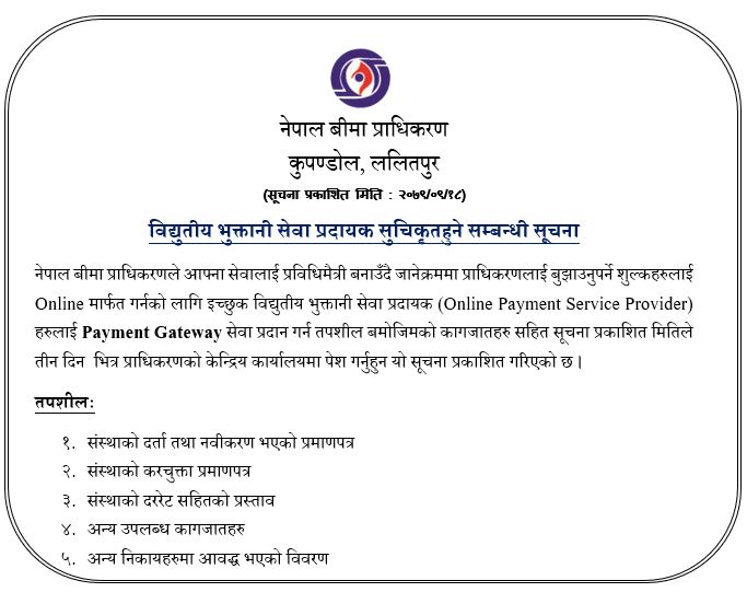 त्यस्तै सम्बन्धित कम्पनीले आफ्नो करचुक्ता प्रमाणपत्र पेश गर्नुपर्नेछ । यसका साथै आफ्नो दररेट सहितको प्रस्ताव पेश गर्नु पर्नेछ । अन्य निकायहरुमा आवद्ध भएको विवरण पनि पेश गर्न सकिनेछ । नेपाल राष्ट्र बैंकले पछिल्लो समय विद्युतीय भुक्तानीलाई प्रोत्साह गर्दै आएको छ । सोहि अनुरुप बीमा कम्पनीहरुले पनि विभिन्न विद्युतीय भक्तानी सेवा प्रदायकलाई आफ्नो प्रणालीमा जोडेर सहजै बीमा शुल्क भुक्तानी गर्न मिल्ने व्यवस्था मिलाएका छन् ।