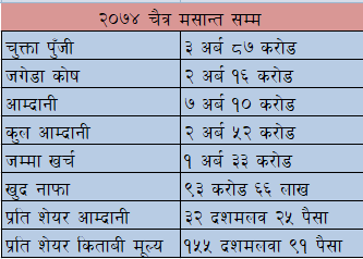 इन्स्योरेन्स खबर/काठमाडौँ: धितोपत्र बोर्डबाट प्रिमियममा प्राथमिक निष्कासन (आइपिओ ) गर्ने लागेको शिवम् सिमेन्टले  चैत्र महिना सम्मको वित्तीय विवरण सार्वजनिक गरेको छ। कम्पनीले यो ९ महिनाको अवधिमा ९३ करोड ६६ रुपैयाँ खुद नाफा गर्न सफल भएको छ। कम्पनीको जगेडा कोषमा २ अर्ब १६ करोड रुपैया छ।  आइपिओ पश्चात् कम्पनीको पुँजी ४ अर्ब ४० करोड पुग्ने छ।