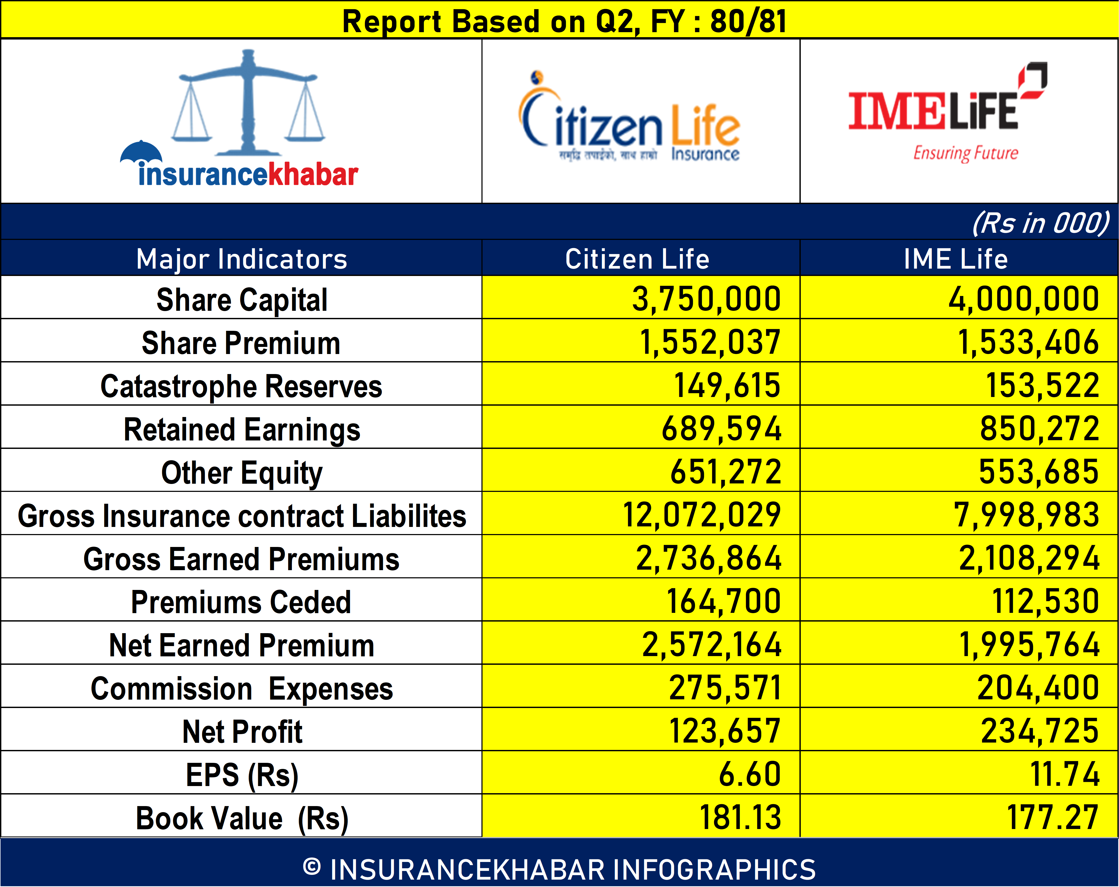 कुल बीमाशुल्क आर्जनः सिटिजन लाइफले चालु आर्थिक वर्षको दोस्रो त्रैमाससम्म २ अर्ब ७३ करोड रुपैयाँ कुल बीमाशुल्क आर्जन गरेको छ भने आइएमई लाइफले २ अर्ब १० करोड रुपैयाँ कुल बीमाशुल्क आर्जन गरेको छ।