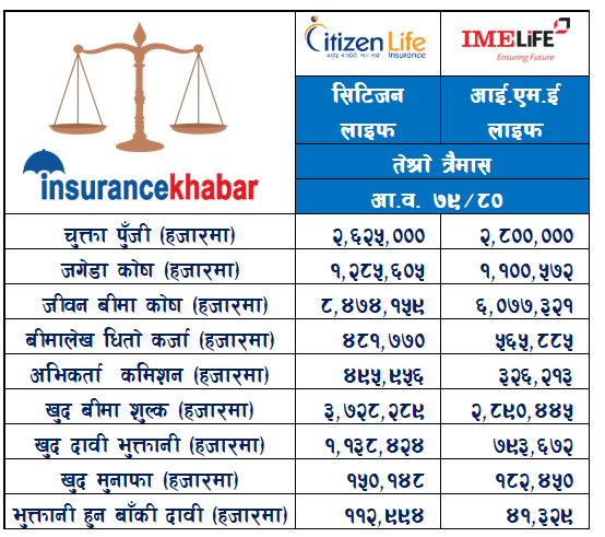 बीमा शुल्क आर्जन : सिटिजन लाइफले चालु आर्थिक वर्षको तेश्रो त्रैमाससम्म ३ अर्ब ७२ करोड खुद बीमा शुल्क आर्जन गरेको छ भने आइएमई लाइफ इन्स्योरेन्सले २ अर्ब ८९ करोड खुद बीमा शुल्क आर्जन गरेको छ।