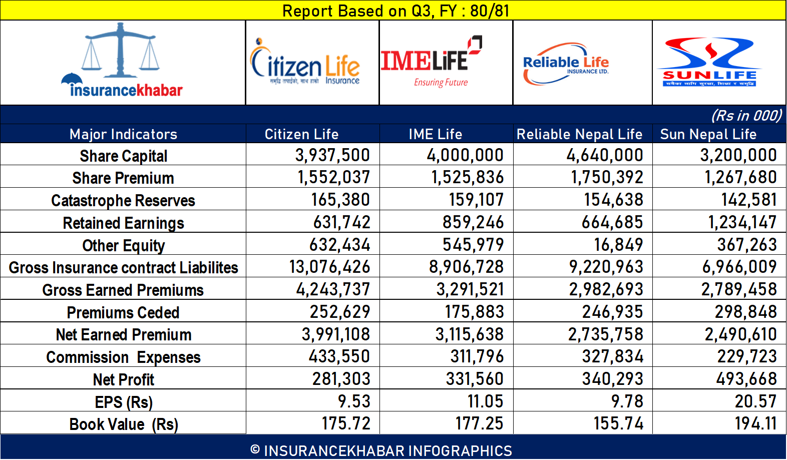तेस्रो त्रैमाससम्म सिटिजन लाइफले २८ करोड १३ लाख रुपैयाँ खुद मुनाफा गरेकोमा आइएमई लाइफले ३३ करोड १५ लाख रुपैयाँ खुद मुनाफा गरेको छ। त्यस्तै रिलायबल नेपाल लाइफले ३४ करोड २ लाख रुपैयाँ खुद मुनाफा गरेकोमा सन नेपाल लाइफले ४९ करोड ३६ लाख रुपैयाँ खुद मुनाफा गरेको छ। यद्यपि, जीवन बीमा कम्पनीहरुको हकमा भने एक्चुअरी मूल्यांकन हुन बाँकी भएकाले खुद नाफा एक्चुअरी मूल्यांकनपश्चात मात्र वास्तविक आउनेछ।