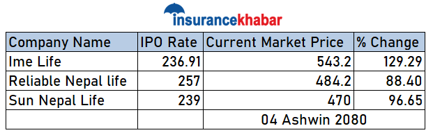 काठमाडौं । प्रिमियममा आईपीओ निष्काशन गरेका जीवन बीमा कम्पनीहरुको प्राथमिक शेयर (आईपीओ) मा लगानी गर्ने लगानीकर्तालाई राम्रै प्रतिफल भएको छ । ४ जीवन बीमा कम्पनी आईएमई लाइफ, रिलायबल नेपाल लाइफ, सन नेपाल लाइफ र सिटिजन लाइफले प्रिमियम मूल्यमा आईपीओ निष्काशन गरे तापनि सिटिजन लाइफको आईपीओ धितोपत्र दोश्रो बजार नेप्सेमा सूचीकृत हुन बाँकी छ ।