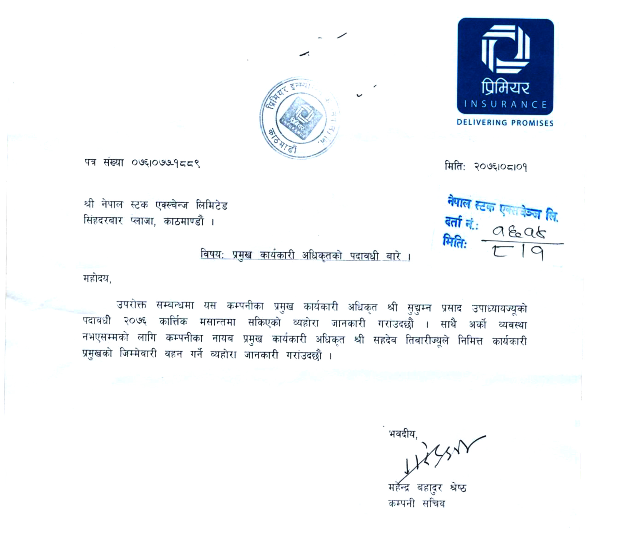 प्रिमियर इन्स्योरेन्स कम्पनीले निमित्त सिईओको जिम्मेवारी नायब कार्यकारी अधिकृत सहदेव तिवारीलाई तोकेको कम्पनीका सचिव महेन्द्र बहादुर श्रेष्ठले जनाएका छन् ।