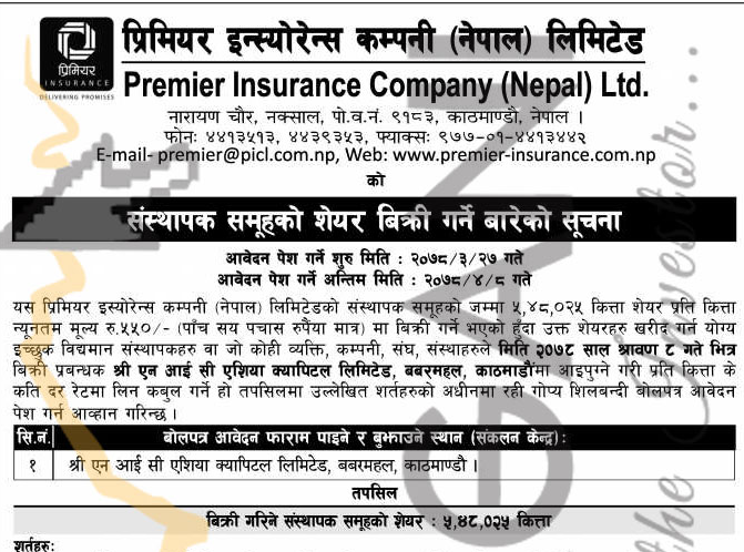 काठमाडौं । प्रिमियर इन्स्योरेन्स कम्पनी (नेपाल) लिमिटेडको संस्थापक शेयर आज असार २७ गतेदेखि लिलामीमा विक्री खुला हुने भएको छ । कम्पनीले ५ लाख ४८ हजार २५ कित्ता संस्थापक शेयर लिलामीमा विक्री खुला गर्ने भएको हो ।