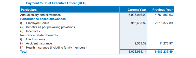 उनि भन्दा अगाडीका प्रमुख कार्यकारी अधकृतले भने बोनश मात्रै २२ लाख १६ हजार रुपैयाँ प्राप्त गरेका थिए । त्यस्तै अघिल्लो आर्थिक वर्षमा कम्पनीले प्रमुख कार्यकारी अधिकृतलाई तलब मात्रै ४७ लाख ६१ हजार सहित जम्मा ६९ लाख ८९ हजार रुपैयाँ खर्चिएको थियो । तिमिला प्रिमियर इन्स्योरेन्स कम्पनीको प्रमुख कार्यकारी अधिकृतमा २०७६ पुसमा नियुक्त भएका थिए । अघिल्लो आर्थिक वर्षमा प्रमुख कार्यकारी अधिकृतका लागि खर्च भएको केहि रकम उनको भागमा पनि परेको छ।