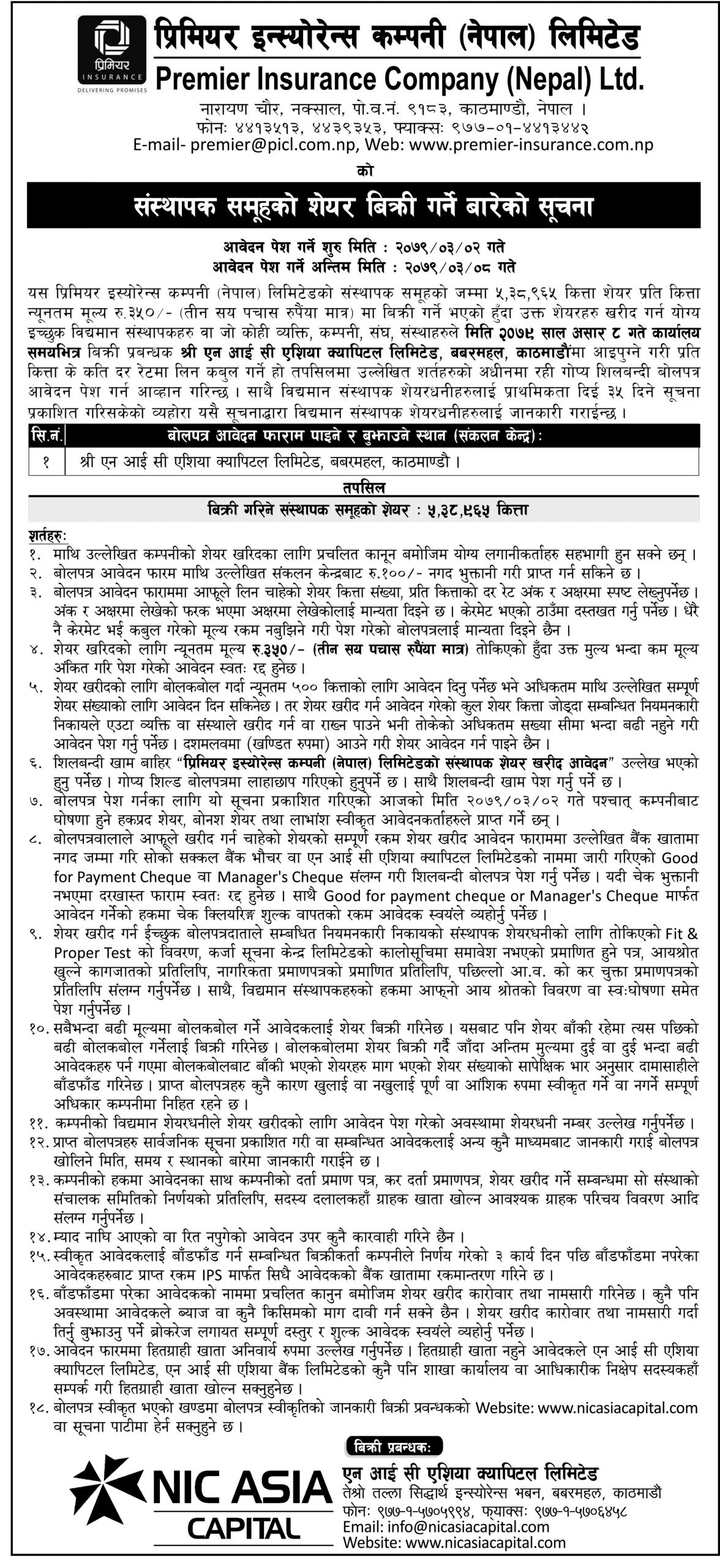 काठमाडौं । प्रिमियर इन्स्योरेन्स कम्पनी (नेपाल) लिमिटेडले आजदेखि संस्थापक शेयर लिलामीमा विक्री खुला गरेको छ । कम्पनीले ५ लाख ३८ हजार ९६५ कित्ता संस्थापक शेयर लिलामीमा विक्री खुला गरेको हो ।