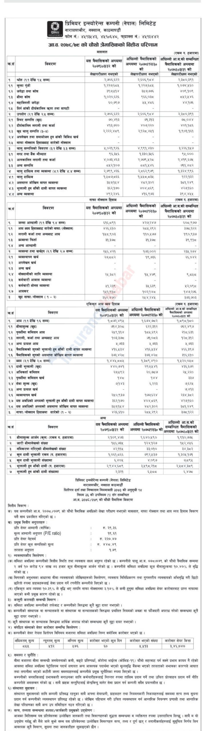 काठमाडौं । प्रिमियर इन्स्योरेन्सले गत आर्थिक वर्ष (७८/७९ )को चौथो त्रैमासको वित्तीय विवरण सार्वजनिक गरेको छ । उक्त विवरण अनुसार कम्पनीको कुल बीमा शुल्क आर्जन १० दशमलव ४० प्रतिशतले वृद्धि हुँदै २ अर्ब १० करोड पुगेको छ । अघिल्लो आर्थिक वर्ष (७७/७८ ) मा कम्पनीले १ अर्ब ९१ करोड बीमा शुल्क आर्जन गरेको थियो ।
