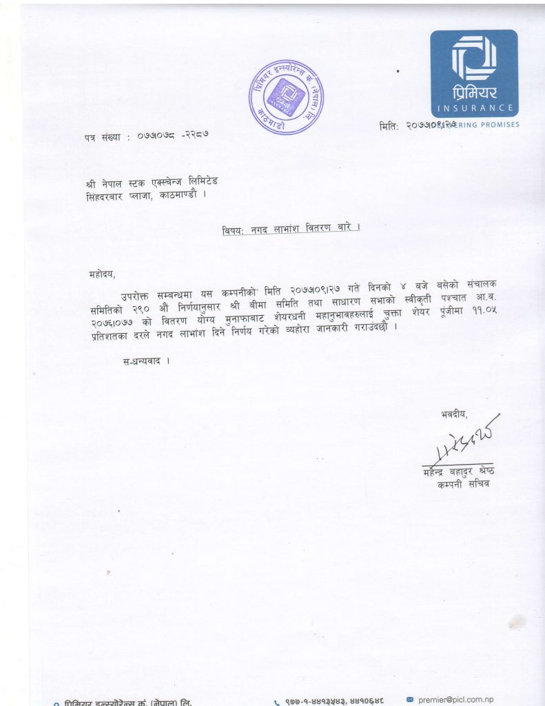 प्रिमियर इन्स्योरेन्सद्धारा लाभांश घोषणा