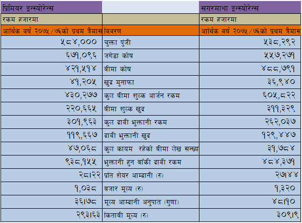 खुद नाफाको आधारमा प्रिमियर इन्स्योरेन्स अघि छ। प्रिमियर इन्स्योरेन्सले चालु आर्थिक वर्षको प्रथम त्रैमास सम्म ४ करोड १२ लाख खुद नाफा कमाएको छ भने सगरमाथा इन्स्योरेन्सले प्रथम त्रैमास सम्म ३ करोड ६९ लाख रुपैया कमाएको छ।
