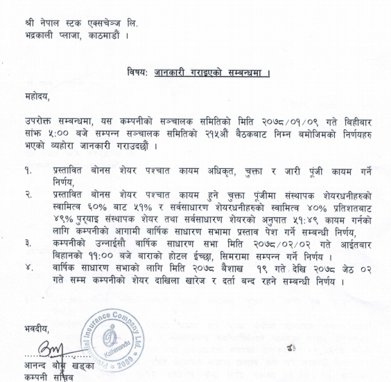 सभामा लाभांश सहितका विभिन्न प्रस्ताव पेश हुने भएको छ । साथै कम्पनीले हाल कायम चुक्ता पुँजीको ८ प्रतिशतले हुन आउने ८ करोड २१ लाख १४ हजार ५ सय ६० रुपैयाँ बराबरको बोनस शेयर र कर प्रयोजनको लागि ०.४२ प्रतिशतले हुन आउने ४३ लाख २१ हजार ८ सय १८ रुपैयाँ १५ पैसा बराबरको नगद लाभांश वितरणको प्रस्ताव गरेको छ।