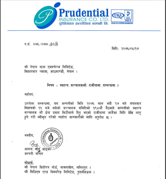 काठमाडौँ । प्रुडेन्सियल इन्स्योरेन्स कम्पनी लिमिटेडको स्वतन्त्र सञ्चालक सिटौलाको राजीनामा स्वीकृत भएको छ ।