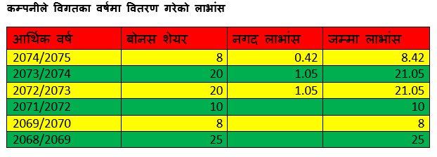 कम्पनीले आर्थिक वर्ष २०७४/७५ को वार्षिक साधारणसभा गर्न बाँकी छ। प्रस्तावित लाभांस नियामक निकायबाट स्वीकृति दिए पछि वार्षिक साधारणसभामा पर्ने गर्ने जनाएको छ। साधारणसभाले प्रस्तावित लाभांस पारित गरे पछि शेयरधनीहरुले प्राप्त गर्न सक्ने छन्। बोनस शेयर पछि कम्पनीको चुक्ता पुँजी एक अर्ब १० करोड रुपैयाँ पुग्नेछ।