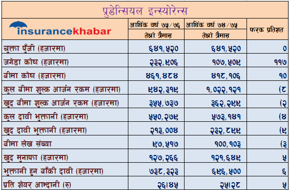 प्रुडेन्सियल इन्स्योरेन्सले चालु आर्थिक वर्षको तेश्रो त्रैमासको वित्तिय विवरण सार्वजनिक गरेको छ । कम्पनीले आर्थिक वर्ष ७५/७६ को तेश्रो त्रैमास सम्म ९४ करोड २३  लाख कुल बीमा शुल्क आर्जन गरेको छ । कम्पनीले अघिल्लो आर्थिक वर्षको तेश्रो त्रैमास सम्म १ अर्ब २ करोड कुल बीमा शुल्क आर्जन गरेको थियो । कुल बीमा शुल्क आर्जन रकम ८ प्रतिशतले कम  भएको छ । त्यस्तै कम्पनीले ३५ करोड ५७ लाख खुद बीमा शुल्क आर्जन गरेको छ । खुद बीमा शुल्क आर्जन रकम २ प्रतिशतले घटेको छ ।