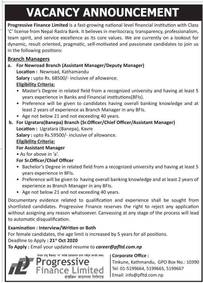 फाइनान्स कम्पनीले आफ्नो विभिन्न शाखा कार्यालयका लागि कर्मचारीको माग गरेको जनाएको छ । ईच्छुक तथा योग्यता पुुगेका नेपाली नागरिकले २१ अक्टोबरभित्र आवेदन दिइसक्नुुपर्ने छ ।