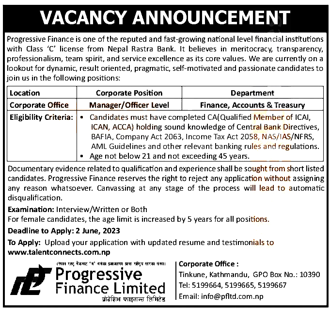 काठमाडौं । प्रोग्रेशिभ फाइनान्स लिमिटेडले कर्मचारी माग गरेको छ । कम्पनीले वित्ती, लेखा र ट्रेजरी विभागमा म्यानेजर पदका लागि केही संख्यामा कर्मचारी माग गरेको हो । कम्पनीका अनुसार सो पदमा आवेदन दिनको लागि मान्यताप्राप्त शैक्षिक संस्थाबाट सिए लगायत अन्य सम्बन्धित विषयमा अध्ययन पुरा गरेको हुनुपर्ने जनाएको छ । ईच्छुक तथा योग्यता पुगेका उम्मेदवारले जेठ १९ गतेभित्र आवेदन दिन सक्नेछन् ।