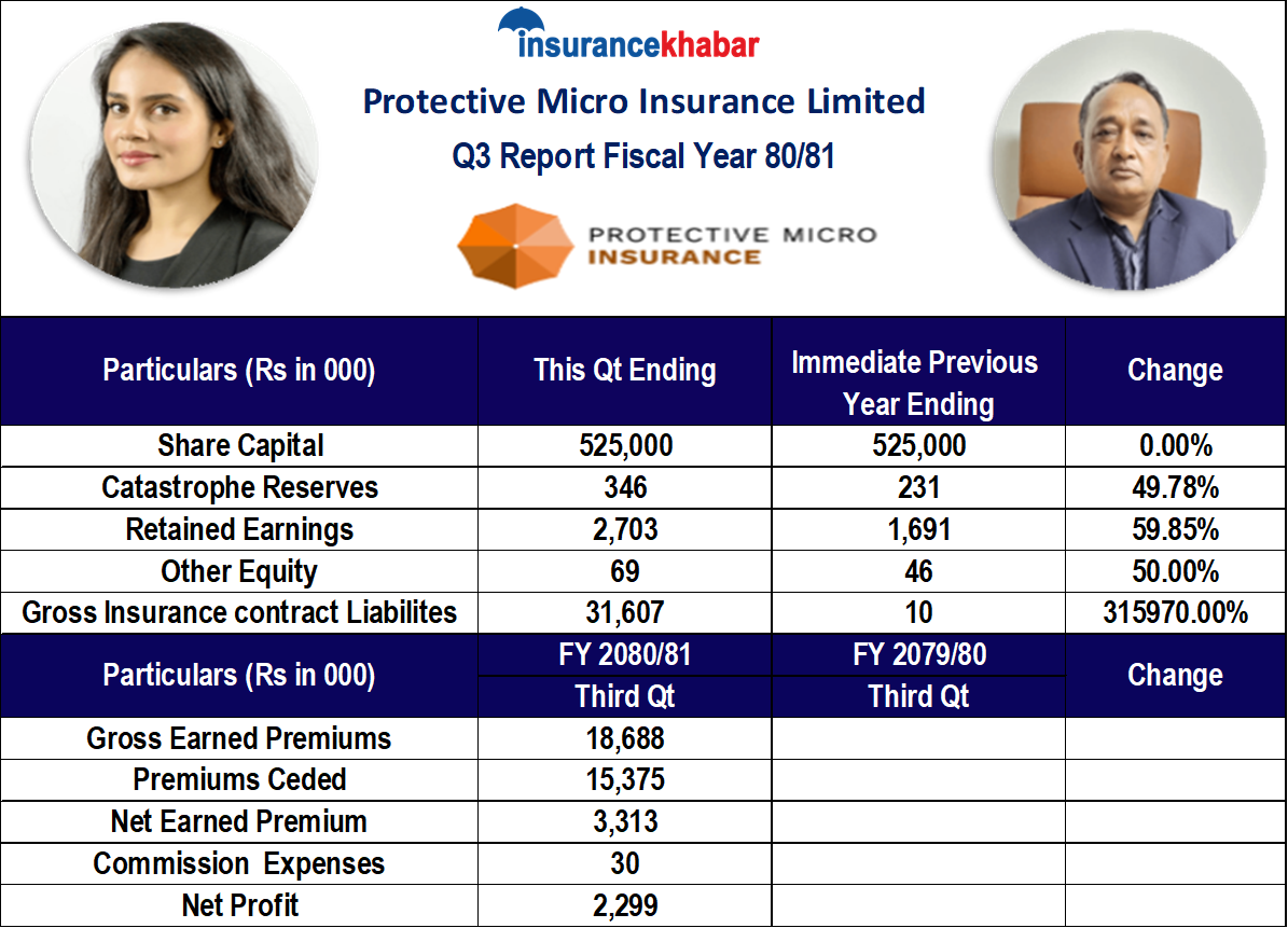 काठमाडौं । प्रोटेक्टिभ माइक्रो इन्स्योरेन्सले चालु आर्थिक वर्ष २०८०/८१ को तेश्रो त्रैमासको वित्तीय विवरण प्रकाशन गरेको छ।