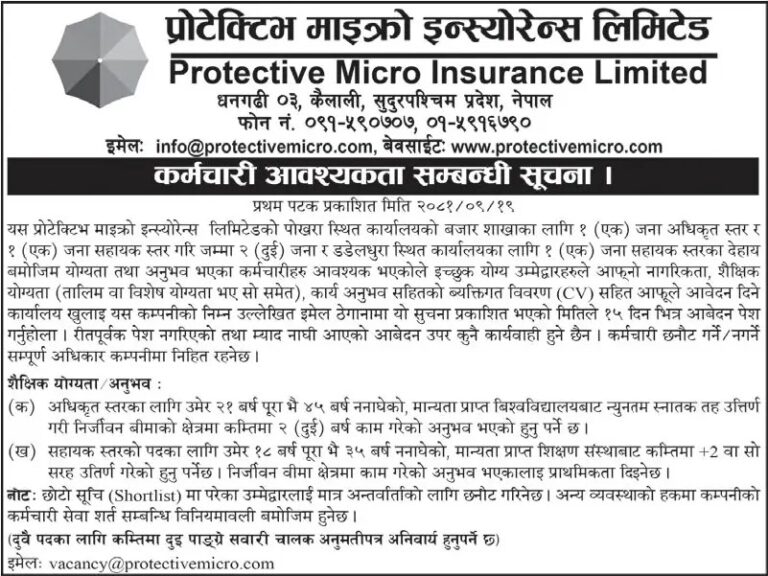 काठमाडौं । प्रोटेक्टिभ माइक्रो इन्स्योरेन्स लिमिटेडले विभिन्न ठाउँका लागि कर्मचारी माग गरेको छ। कम्पनीले पोखरास्थित कार्यालयको बजार शाखामा १ जना अधिकृत स्तर, १ जना सहायक स्तर र डडेलधुरा स्थित कार्यालयका लागि १ जना सहायक स्तरका लागि गरी कुल ३ जना कर्मचारी माग गरेको हो। ईच्छुक तथा योग्यता पुगेका व्यक्तिले आवश्यक कागजात संलग्न गरी सूचना प्रकाशित भएको मितिले १५ दिनभित्र अर्थात माघ ४ गतेभित्र आवेदन दिनु पर्नेछ।