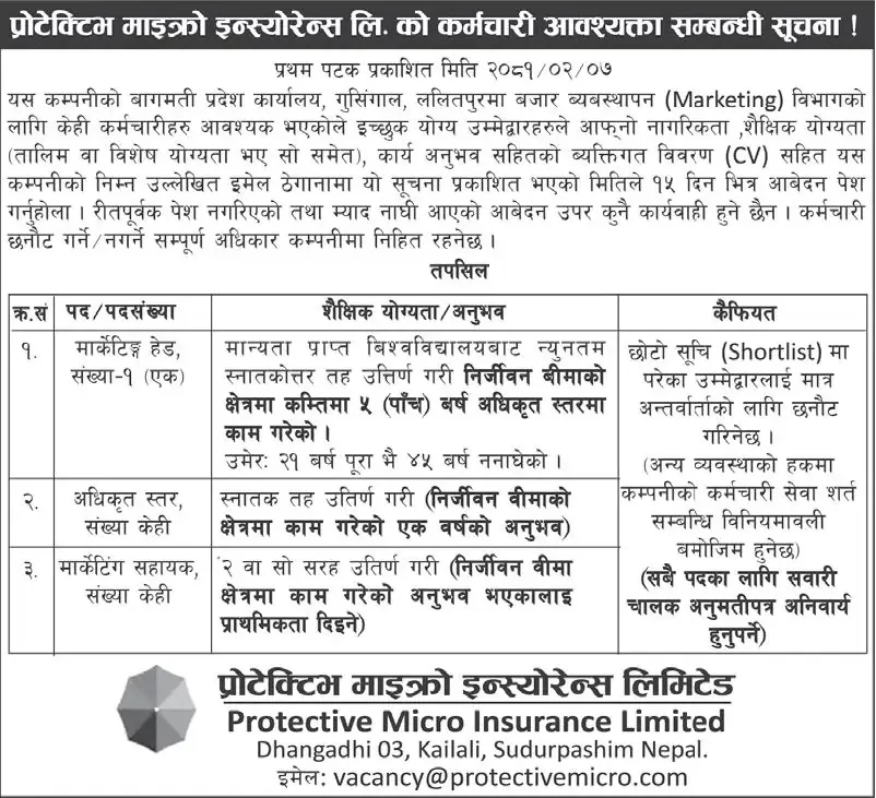 काठमाडौं । प्रोटेक्टिभ माइक्रो इन्स्योरेन्स कम्पनीले माग गरेको कर्मचारीको लागि आवेदन दिने अन्तिम दिन रहेको छ । विभिन्न ३ पदका लागि कर्मचारी माग गरेको छ । कम्पनीले मार्केटिङ हेडमा १ जना, अधिकृत स्तरको लागि केही र मार्केटिङ सहायकका लागि केही संख्यामा कर्मचारी माग गरेको हो । इच्छुक तथा योग्यता पुगेका व्यक्तिहरुले सूचना प्रकाशित भएको मितिले १५ दिनभित्र अर्थात जेठ २१ गतेभित्र आवेदन दिनुपर्नेछ । ईच्छुकले निर्जीवन बीमा क्षेत्रमा १ वर्षदेखि ५ वर्षसम्मको अनुभव भएको हुनुपर्नेछ ।