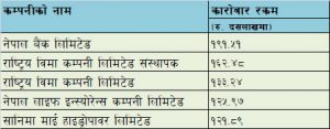 यो साता कारोबार रकमका आधारमा नेपाल बैंक लिमिटेड अगाडि देखिएको छ । बैंकको १९ करोड १५ लाख १० हजार रुपैयाँ बराबरको ५ लाख २४ हजार कित्ता सेयर किनबेच भएका छन् । त्यसैगरी कारोबार संख्याको आधारमा प्रिमियर इन्स्योरेन्स कम्पनी अग्रस्थानमा रहेको छ । कम्पनीको १ हजार ५ सय ५ वटा कारोबार भएको देखिन्छ ।