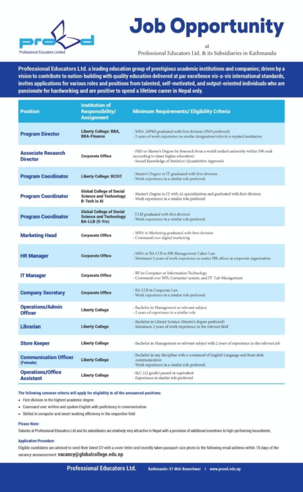 काठमाडौं । राजधानीमा शिक्षण संस्थाहरू सञ्चालन गरिरहेको प्रोफेशनल एजुकेटर्स लिमिटेडले विभिन्न १४ वटा पदमा जनशक्ति भर्नाका लागि आवेदन मागेको छ। कम्पनीले लिबर्टी कलेज, ग्लोबल कलेज र कर्पोरेट कार्यालयका लागि जनशक्ति भर्ना गर्न लागेको हो।