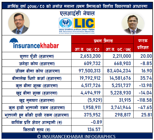 बीमालेख धितोमा राखेर कर्जा लिने क्रम बढेको छ । कम्पनीले मात्रै यस्तो कर्जा १९ अर्ब ७९ करोड रुपैयाँ प्रवाह गरेको छ । दीर्घकालिन कर्जा ७० अर्ब माथि छ । चुक्ता पूँजी २ अर्ब ६५ करोड रुपैयाँ रहेको एलआइसीको जगेडा कोषमा ६० करोड ९७ लाख रुपैयाँ सञ्चित छ । जीवन बीमा कोष ९७ अर्ब ५० करोड रुपैयाँ नाघेको छ । गत वर्षको यहि अवधिमा यस्तो कोषमा ८३ अर्ब ४० करोड रुपैयाँ थियो । नोक्सानीका कारण प्रतिशेयर आम्दानी ऋणात्मक छ भने प्रतिशेयर नेटवर्थ १३६ रुपैयाँ छ ।