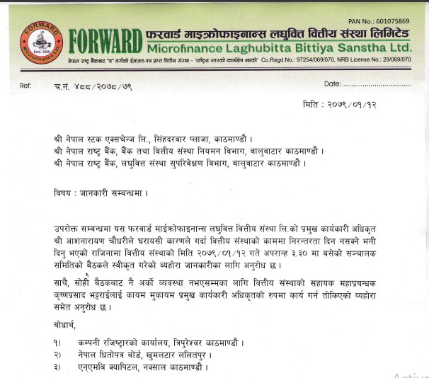 काठमाडौं । फरवार्ड माइक्रोफाइनान्स वित्तीय संस्थाको कायम मुकायम (कामु) प्रमुख कार्यकारी अधिकृतको जिम्मेवारी कृष्णप्रसाद भट्टराईले पाएका छन् । कम्पनीका प्रमुख कार्यकारी अधिकृत आशनारायण चौधरीले घरयासी कारण देखाई सिइओ पदबाट राजीनामा दिएका हुन् ।