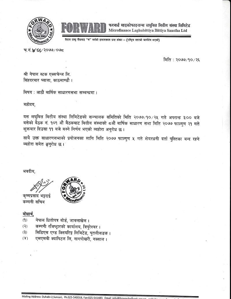 काठमाडौं । फरवार्ड माइक्रोफाइनान्स वित्तीय संस्था लिमिटेडले आज फागुन २१ गते ८औं वार्षिक साधारण सभा गर्ने भएको छ । कम्पनीको माघ २५ गतेको सञ्चालक समितिले सभाको मिति तय गरेको हो । उक्त सभा बिहान ११ बजे सभा गर्ने जनाएको छ ।