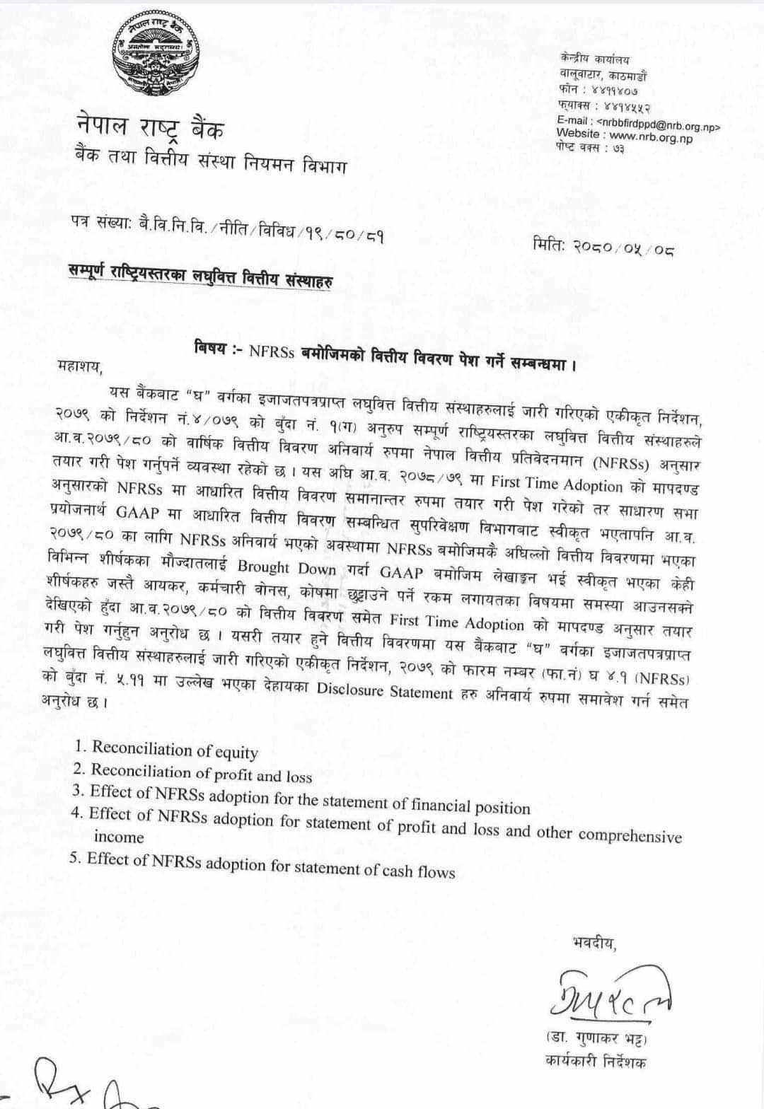 लघुवित्त वित्तीय संस्थाहरुलाई जारी गरिएको एकीकृत निर्देशन, २०७९ को निर्देशन नं ४–०७९ को बुँदा नं. १(ग) अनुरुप सम्पूर्ण राष्ट्रियस्तरका लघुवित्त वित्तीय संस्थाहरुले आर्थिक वर्ष २०७९/८० को वार्षिक वित्तीय विवरण अनिवार्य रुपमा नेपाल वित्तीय प्रतिवेदनमान (एनएफआरएसएस) अनुसार तयार गरी पेस गर्नुपर्ने व्यवस्था छ ।