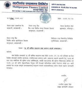 काठमाडौं । मल्टीपर्पस फाइनान्स लिमिटेडले लेखापरीक्षक नियुक्त गरेको छ । फाइनान्सले कम्पनी ऐन, २०६३ को दफा १११ बमोजिम सुविज एण्ड एसोसिएट्स, चार्टर्ड एकाउन्टेन्टका सुविज पौडेललाई २०७९/८० को लागि लेखापरीक्षकको रुपमा नियुक्त गरेको हो ।