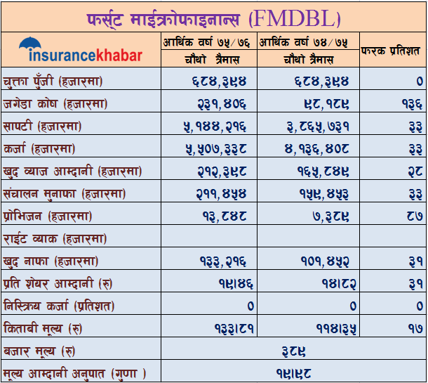 फर्स्ट माईक्रोफाईनान्सले आर्थिक वर्ष ७५/७६ को चौथो त्रैमासको वित्तीय विवरण सार्वजनिक गरेको छ। कम्पनीले १३ करोड ३२ लाख खुद नाफा गरेको छ। अघिल्लो आर्थिक वर्ष १० करोड १४ लाख खुद नाफा गरेको थियो। कम्पनीको खुद नाफा ३१ प्रतिशतले वृद्धि हुन् सफल भएको छ।