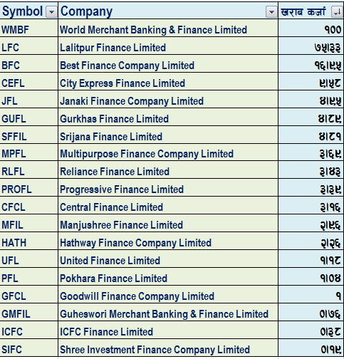 खराब कर्जाको आधारमा वोर्ल्ड मर्चेन्टको खराब कर्जा सबै  भन्दा धेरै छ।  वोर्ल्ड मर्चेन्टको खराब कर्जा १०० प्रतिशत छ। ४ फाइनान्स कम्पनीको खराब कर्जा ५ प्रतिशत भन्दा माथि छ। वोर्ल्ड मर्चेन्ट, ललितपुर फाइनान्स, बेष्ट फाइनान्स, सिटी एक्सप्रेस फाइनान्सको खराब कर्जा ५ प्रतिशत भन्दा माथि छ।