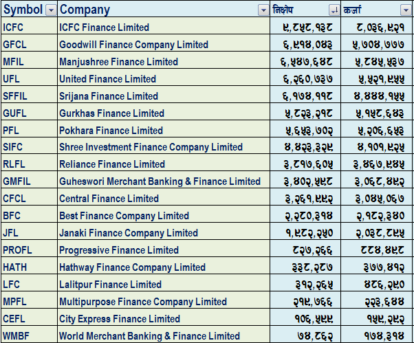 निक्षेप र कर्जाको आधारमा आइसीएफसी फाइनान्स अघि छ।  आइसीएफसी फाइनान्सले ९ अर्ब ८५ करोड रुपैयाँ निक्षेप संकलन गरेको छ भने ८ अर्ब ३  करोड  रुपैयाँ कर्जा प्रवाह गरेको छ।