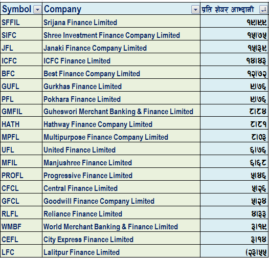 सबैभन्दा धेरै किताबी मूल्य मल्टी पर्पोज फाइनान्सको रहेको छ। ५ फाइनान्स कम्पनीको किताबी मूल्य १०० रुपैया भन्दा मुनी छ।  बेस्ट फाइनान्स, सिटी एक्सप्रेस, हाथवे फाइनान्स, ललितपुर फाइनान्स र वोर्ल्ड मर्चेन्टको किताबी मूल्य एक सय रुपैयाँ भन्दा मुनी छ।